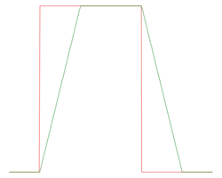 Pour un µA741, le courant de polarisation =10 µA et la capacité de compensation interne C=30 pF ce qui donne une vitesse de balayage de 0,67 V/µs et est en accord avec ce qui peut être mesuré[35]. Si l'AOP ne possède pas de capacité de compensation, le slew-rate est déterminé par les capacités parasites internes à l'AOP[36]. De tels AOP possèdent un slew-rate et une bande passante plus importante que les AOP compensés, mais ils ne sont pas stables lors d'une utilisation en suiveur[36].