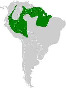 Cet oiseau se rencontre en Bolivie, au Brésil, en Colombie, en Équateur, au Guyana, en Guyane, au Pérou, au Suriname et au Venezuela[1].