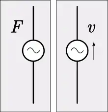 La représentation matricielle de l'impédance d'un transducteur transforme la force dans le domaine mécanique en courant dans le domaine électrique. De même, la vitesse dans le domaine mécanique est transformée en tension dans le domaine électrique. Un dispositif à deux ports qui transforme une tension en une grandeur analogue peut être représenté comme un simple transformateur. Un dispositif qui transforme une tension en un analogue de la double propriété de la tension (c'est-à-dire le courant, dont l'analogue est la vitesse) est représenté par un gyrateur[18]. Étant donné que la force est analogue à la tension et non au courant, cela peut sembler un inconvénient à première vue. Cependant, de nombreux transducteurs pratiques, en particulier aux fréquences audio, fonctionnent par induction électromagnétique et sont régis par une telle relation[19]. Par exemple, la force sur un conducteur sous tension est donnée par,