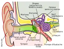 Le schéma de circuit montre un modèle d'analogie d'impédance de l'oreille humaine. La section du conduit auditif est suivie d'un transformateur représentant le tympan. Le tympan est le transducteur entre les ondes acoustiques dans l'air du conduit auditif et les vibrations mécaniques dans les os de l'oreille moyenne. Au niveau de la cochlée, il y a un autre changement de milieu des vibrations mécaniques au fluide remplissant la cochlée. Cet exemple démontre ainsi la puissance des analogies électriques pour réunir trois domaines (acoustique, mécanique et fluidique) en un seul ensemble unifié. Si les impulsions nerveuses circulant vers le cerveau avaient également été incluses dans le modèle, le domaine électrique aurait fait quatre domaines englobés dans le modèle.