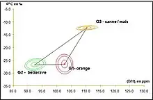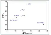 - avec des résultats de RMN-FINS ((D/H)I) qui peuvent différencier l’origine botanique de sucres au sein du même groupe métabolique (la betterave opposée à l’orange ou le raisin).