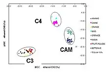 - résultats mesurés par IRMS (la déviation isotopique δ 13C), qui permettent de différencier les plantes en fonction de leur métabolisme photosynthétique (métabolisme C4 comme le maïs opposé au C3 comme la betterave, l’orange ou le raisin) ;