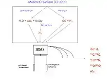 Les rapports isotopiques d'une molécule peuvent être déterminés par spectrométrie de masse à rapport isotopique (IRMS), la quantité d'échantillon utilisée pour l’IRMS est beaucoup plus faible que celle utilisée pour la RMN, et il est possible de coupler le spectromètre de masse à un système chromatographique pour permettre la purification ou l’analyse de plusieurs constituants d'un mélange complexe. Cependant l’échantillon est brûlé après une transformation physique comme la combustion ou la pyrolyse. On obtient alors une valeur moyenne de la concentration de l’isotope étudié sur l'ensemble des sites de la molécule. C’est la méthode AOAC officielle utilisée pour obtenir le rapport moyen 13C/12C (ou δ 13C) des sucres ou d’un alcool et la méthode officielle CEN et OIV pour l’analyse du rapport 18O/16O dans l’eau.