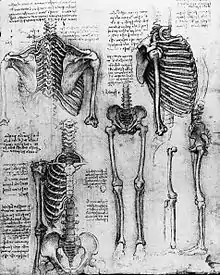 L'apprentissage de l'anatomie artistique consiste en la description d'environ deux cents os, réduits en fait à la moitié du fait de la symétrie du corps, de la notion de leurs proportions ordinaires et surtout, de leurs possibilités d'articulation. On remarque, par exemple, que le corps étant debout, bras relâchés sur les côtés, la main arrive sur le côté de la cuisse à une distance d'une main au-dessus du genou[6]. L'artiste se constitue ainsi une série de repères qui facilitent la construction du dessin et la détection d'erreurs ou d'illusions visuelles.