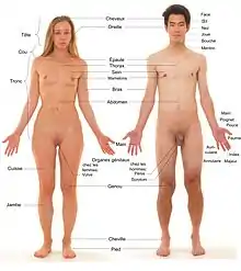 L'anatomie humaine est la description de la structure du corps de l’Homo sapiens, de ses organes et de leur position (Anatomie topographique). Le corps humain présente quatre membres — deux membres supérieurs (bras, Avant-bras, Mains), deux membres inférieurs (Cuisses, Jambes, Pieds) — reliés au Tronc, respectivement, par l'intermédiaire de la ceinture scapulaire et de la Ceinture pelvienne. À la partie supérieure, le Cou supporte la Tête.