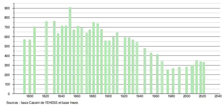 L'évolution du nombre d'habitants est connue à travers les recensements de la population effectués dans la commune depuis 1793. Pour les communes de moins de 10 000 habitants, une enquête de recensement portant sur toute la population est réalisée tous les cinq ans, les populations légales des années intermédiaires étant quant à elles estimées par interpolation ou extrapolation[28]. Pour la commune, le premier recensement exhaustif entrant dans le cadre du nouveau dispositif a été réalisé en 2007[29].