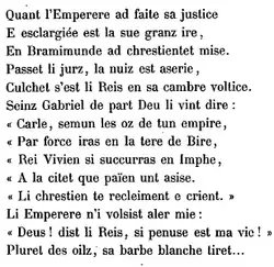 ![]() Derniers vers du texte en ancien français de La Chanson de Roland, XIIe siècle (édition de Léon Gautier). |
