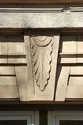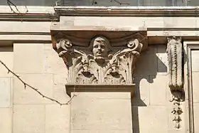 Les trois travées centrales sont plus ornées que les travées latérales. Les pilastres colossaux y sont surmontés chacun d'un chapiteau d'ordre composite[2] d'où émerge un mascaron figurant un visage de femme, et la décoration des fenêtres du premier étage y est plus soignée. Ces fenêtres sont encadrées de piédroits à imposte saillante supportant un arc en plein cintre dont le tympan est orné d'un cartouche orné de feuillages et de rubans. Les fenêtres des travées latérales, plus simples, sont surmontées de cartouches[3] marqués « Val St Lambert 1825 » et « Val St Lambert 1914 ».