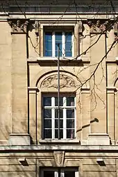 L'immeuble possède une large façade en pierre d'Euville, de trois niveaux et cinq travées, surmontée d'une toiture à la Mansart[2].