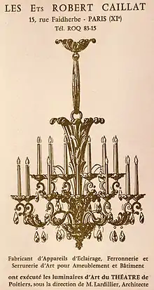 Les projets d'architecte conservés aux archives municipales de Poitiers[14] montrent des bas-reliefs d'inspiration hellénique (joueurs de syrinx, lyres) prévus sur la façade, dans une tradition remontant aux salles du XIXe siècle. Cette idée a été abandonnée, au profit du décor intérieur.