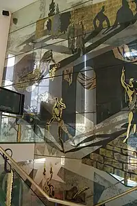 Réalisé après la construction du bâtiment, et posé en 1956, ce miroir, ou "damier" pour reprendre les termes de l'époque, est l’œuvre des ateliers parisiens de Robert Pansart, (1909-1973) d'après un carton du peintre français d'origine serbe André Grozdanovitch (1912-1997).