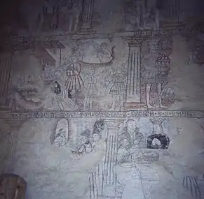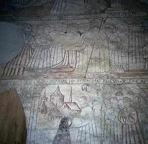 L'église est connue pour ses 114 peintures murales réalisées dans les années 1560[2]. Les décorations sont organisées en trois alignements[1]. Les peintures du niveau supérieur représentent des événements des livres de la Genèse et de l'Exode[2]. Celles du niveau intermédiaire représentent des événements de la vie de Jésus[2] et la rangée inferieure illustre des paraboles des jours saints[2]. Les peintures ont été financées par l'homme d'église Jaakko Geet[1]. En 1666, l'homme d'église Isak Brenner fait recouvrir les peintures de chaux et elles sont progressivement oubliées[1]. Les peintures sont retrouvées et découvertes en 1885[2].