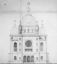 Le toit au-dessus du transept est plat et couronné de quatre petits dômes situés chacun à un des coins du toit. Au-dessus du transept se trouve un tambour cylindrique avec douze fenêtres éclairant l'intérieur de la synagogue, surmonté du dôme central miroitant, recouvert de cuivre vert patiné. La façade d'entrée est agrémentée, de part et d'autre du portail, de deux lanterneaux d'ornement surmontés chacun d'un petit dôme. Cette abondance de dômes doit rappeler l'architecture persane ou indienne comme le Taj Mahal.