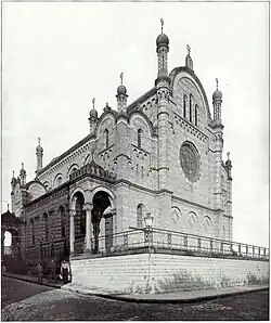 L'architecte… a érigé les arcs en plein cintre des arcades et du chœur de l'orgue dans un style oriental, il a appliqué à l'extérieur une polychromie vive en insérant des bandes de grès brun-rouge dans les surfaces de briques blanches et jaunes, il a donné aux multiples pignons de toit une forme systématiquement semi-circulaire, il a placé des tourelles avec des dômes en forme de minaret aux extrémités de chaque pignon, Il a protégé chacune des deux entrées principales (à gauche pour les hommes, à droite pour les femmes) par un porche similaire à ceux si souvent utilisés dans les mosquées orientales et a cherché enfin à introduire autant que possible dans les ornements romans individuels aussi bien la ligne en zigzag que des formes végétales naturalistes.