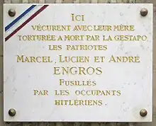 - Au 18 de la rue des Écouffes, une plaque commémorative est posée et rend hommage à la famille Engros, notamment les trois frères et la mère, tous fusillés par les occupants nazis.