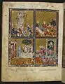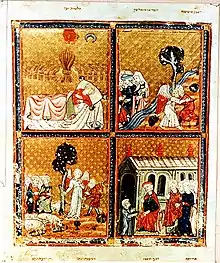 - Enluminures tirées d'une haggada séfarades avec des anges sur des thèmes bibliques : échelle de Jacob, Sacrifice d'Isaac, hospitalité d'Abraham…, XIIIe siècle[n 1]. Haggadah dorée, British Library.
