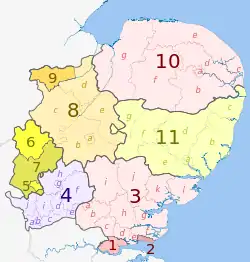 | Carte | Comté cérémonial | Comté non métropolitain | Districts, boroughs et cités |