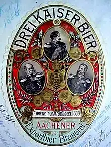 - Pour l'année des trois empereurs, la brasserie d'exportation d'Aix-la-Chapelle (de) met en vente une "bière des trois empereurs" qui reçoit un diplôme d'honneur lors de l'exposition commerciale de Bruxelles.