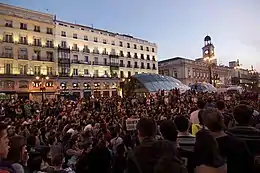 - Le mouvement des Indignés démarre en Espagne en , et se met en place en Europe (France, Grèce…) puis se mondialise : à New-York, Occupy Wall Street dénonce les excès du capitalisme ; au Québec, les manifestants s'opposent aux réformes des prix d'entrée à l'université de Jean Charest et contestent des actions policières ; des mouvements ont également lieu en Israël, à Rio de Janeiro, au Koweït[32]… La France voit aussi apparaitre le mouvement Nuit debout puis celui des Gilets jaunes à partir de .