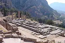 - 548/7 av. J.-C. : incendie du temple d’Apollon à Delphes. Les amphictyons obtiennent l’aide financière de tout le monde grec comme celle du pharaon Amasis pour sa reconstruction. Les Alcméonides, famille d’aristocrates athéniens exilés par Pisistrate, prennent en charge l’adjudication du nouveau temple[6] (terminé vers 513/505 av. J.-C.).