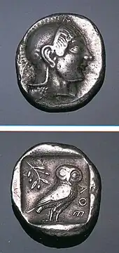 Tétradrachme d’Athènes (Wappenmünzen), VIe siècle av. J.-C., musée de l'Agora antique d'Athènes. Ces monnaies d’argent (Wappenmünzen), à usage uniquement local, se développent sous la tyrannie de Pisistrate. Corinthe frappera des monnaies peu de temps après[9].