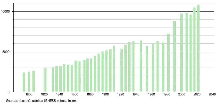 L'évolution du nombre d'habitants est connue à travers les recensements de la population effectués dans la commune depuis 1793. Pour les communes de plus de 10 000 habitants les recensements ont lieu chaque année à la suite d'une enquête par sondage auprès d'un échantillon d'adresses représentant 8 % de leurs logements, contrairement aux autres communes qui ont un recensement réel tous les cinq ans[25],[Note 4].