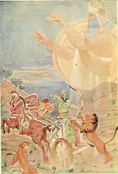 Teglath-Phalasar Ier conduit par Ninib, représenté dans un ouvrage de 1916, Myths and legends of Babylonia and Assyria.
