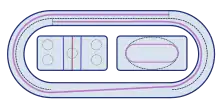 La distance doit être comprise entre 333,33 et 400 mètres. L'anneau est en forme de ligne droite avec deux virages de 180°, dont les rayons doivent mesurer entre 25 et 20 mètres. La largeur de la piste doit être de 4 mètres en compétition. Les normes élevées demandent à l'intérieur de la piste une piste de préparation, également large de 4 mètres. Les lignes de départ et d'arrivée sont différentes pour les distances.