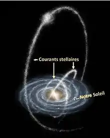 Les bras spiraux et courants stellaires de la Voie lactée pourraient être le résultat d'un impact avec une plus petite galaxie[7].