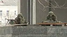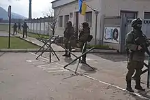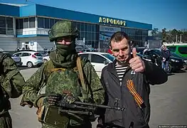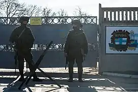 Des hommes en armes dont l'uniforme ne comporte pas de signe permettant leur identification, prennent alors le contrôle de l'aéroport international de Simferopol[25],[26]. Ils sont surnommés « les petits hommes verts »[27]. 300 militaires russes bloquent la base aérienne de Belbek (en), près de Sébastopol (l'aéroport international de Sébastopol)[alpha 5].