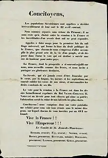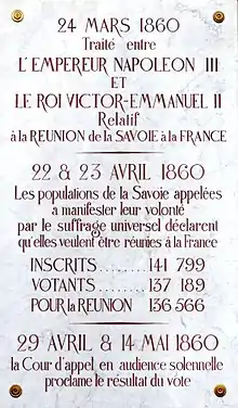 Le plébiscite se déroule les 22 et 23 avril 1860 : c'est la première élection au suffrage universel en Savoie[17], et les électeurs doivent répondre à la question « La Savoie veut-elle être réunie à la France ? ». « Pour Napoléon III, il ne s'agit pas de demander l'avis des citoyens mais de démontrer que sa politique bénéficie d'un soutien populaire. Tout se trouve mis en œuvre pour que les résultats du vote répondent aux attentes de l'Empereur » explique un historien[17]. Les conditions de vote ne permettraient pas de caractériser aujourd'hui le vote de totalement démocratique ; « Les urnes étaient aux mains des mêmes autorités qui avaient issues les proclamations. Les contrôles étaient impossibles »[Note 9], les églises chantent la messe et le "Domine salvum fac Imperatorem" (Seigneur protège l'empereur)[Note 10]. Bien que le travail des conservateurs fut très important, pour l'historien Paul Guichonnet, l'Annexion est « l’œuvre avant tout du clergé »[26]. Le docteur Truchet d'Annecy commentait ainsi cette période « Si les six cents curés savoyards eussent fait opposition à l'annexion, la presque unanimité eût été en sens inverse, soyez-en bien sûrs »[26]. Guichonnet souligne d'ailleurs que cette orientation du clergé savoyard s'est faite « contre l’orientation laïque et pro-italienne de Cavour, par l’aristocratie et le clergé, encadrant des masses rurales sans éducation politique »[27].