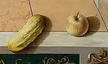 Dans une telle démonstration de compétence, certains éléments de virtuosité de la perspective ne pouvaient manquer, présents dans de nombreuses autres œuvres de l'artiste et inspirés de la culture figurative de l'art padouan : la courge qui fait saillie au premier plan vers le spectateur, comme pour l'inviter à le ramasser, et la pomme, soigneusement ombragée, qui est placée à proximité, éléments symboliques rappelant la fécondité de Marie (qui à cet instant est conçue par le Saint-Esprit) et le Péché originel qui sera lavé par l'incarnation et le sacrifice du Christ[5].