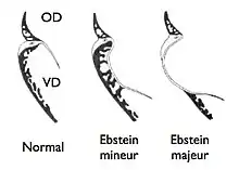 La maladie d'Ebstein est la conséquence d'un défaut plus ou moins complet de ce clivage, qui n'atteint pas l'anneau. Le développement de perforations qui donnent lieu normalement à la formation des cordages et muscles papillaires est incomplet ou absent, d'où le caractère redondant de la valve.