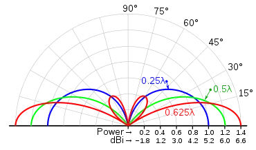 Un peu au-dessus de , le lobe horizontal devient rapidement plus petit et le lobe à angle élevé devient plus grand, ce qui réduit la puissance rayonnée dans les directions horizontales et, par conséquent, le gain. Pour cette raison, peu d'antennes utilisent des longueurs supérieures à ou 0,625× longueur d'onde. Lorsque l'antenne est plus longue, le diagramme se divise en plusieurs lobes, avec des zéros (directions de puissance rayonnée nulle) entre eux.