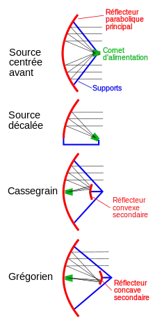 Il existe différents types d'antennes paraboliques se distinguant par la forme de leur réflecteur, notamment celles destinées à capter les signaux provenant de satellites. La plus répandue auprès du grand public est de type « offset » à foyer décalé mais d'autres types comme l'antenne Cassegrain, la prime-focus et l'antenne grégorienne exploitent une apparence mécanique différente.