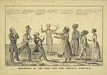 Mais les scissions provoquées par la question de l’esclavage au sein des deux partis dominants, le parti démocrate et le parti whig, changent les plans initiaux du Liberty Party. Des dissidents de l’État de New York, surnommés les Barnburners, quittent le parti démocrate en 1847 devant son refus d’inclure dans sa plate-forme le Wilmo Proviso, une disposition qui aurait interdit l’esclavage dans les territoires acquis lors de la guerre américano-mexicaine. Dans l’autre camp, les « Conscience whigs », menés par Charles Sumner, Henry Wilson et Charles Francis Adams, quittent leur parti après la désignation de Zachary Taylor, un propriétaire d’esclaves, pour l’élection présidentielle de 1848. Les déçus des deux bords se regroupent pendant l’été 1848 avec la majorité des membres du Liberty Party pour former le parti du sol libre (Free Soil Party)[50].