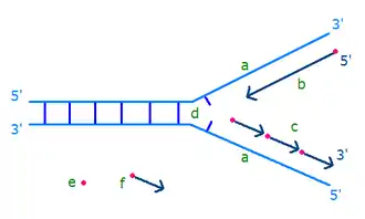 Cependant, les deux brins d'ADN qui constituent la double hélice sont orientés en sens opposés : chaque extrémité de la double hélice est constituée de l'extrémité 5' d'un brin et de l'extrémité 3' de l'autre brin. Ceci a son importance lors de la réplication de l'ADN : l'un des brins de la double hélice, dit brin avancé, est orienté dans le sens 3’ vers 5’, impliquant une progression du brin néoformé dans le sens 5’ vers 3’, qui est celui de la polymérisation par la polymérase, laquelle peut alors le répliquer en continu, tandis que l'autre brin, appelé brin retardé, est orienté dans le sens opposé, de sorte que, pour lui, la polymérisation du brin néoformé se déroule dans le sens 3’ vers 5’, ce qui ne peut se faire que par fragments, appelés fragments d'Okazaki, chaque fragment étant produit dans le sens 5’ vers 3’ :
