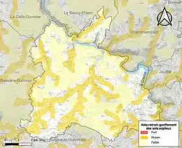 Le retrait-gonflement des sols argileux est susceptible d'engendrer des dommages importants aux bâtiments en cas d’alternance de périodes de sécheresse et de pluie. 30,8 % de la superficie communale est en aléa moyen ou fort (33,6 % au niveau départemental et 48,5 % au niveau national). Sur les 417 bâtiments dénombrés sur la commune en 2019, 105 sont en aléa moyen ou fort, soit 25 %, à comparer aux 25 % au niveau départemental et 54 % au niveau national. Une cartographie de l'exposition du territoire national au retrait gonflement des sols argileux est disponible sur le site du BRGM[16],[Carte 2].
