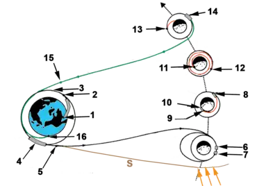 - Apollo 6 () est le deuxième vol du lanceur Saturn V. Le test est peu satisfaisant : deux des moteurs J-2 du 2e étage cessent prématurément de fonctionner, ce qui ne peut être compensé que par une durée de fonctionnement prolongée des autres moteurs de l'étage. Alors que la fusée est sur son orbite de parking, l'unique moteur J-2 du 3e étage refuse de se rallumer pour simuler l'injection sur une trajectoire lunaire. En sollicitant le moteur du vaisseau Apollo, les équipes de la NASA parviennent malgré tout à effectuer les tests attendus. Malgré ces péripéties, la NASA estime que désormais la fusée Saturn V et les véhicules Apollo peuvent embarquer des équipages en toute sécurité[15].