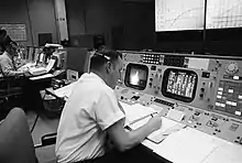 - Le programme Lunar Orbiter, composé de cinq sondes qui sont placées en orbite autour de la Lune en 1966–1967, complète ce travail : une couverture photographique de 99 % du sol lunaire est réalisée, la fréquence des micrométéorites dans la banlieue lunaire est déterminée et l'intensité du rayonnement cosmique est mesurée. Le programme permet également de valider le fonctionnement du réseau de télémesure. Les mesures effectuées indiquent que le champ gravitationnel lunaire est beaucoup moins homogène que celui de la Terre rendant dangereuses les orbites à basse altitude. Le phénomène, sous-estimé par la suite, réduira à 10 km l'altitude de l'orbite du module lunaire (LM, pour lunar module) d’Apollo 15 dont l'équipage était endormi, alors que la limite de sécurité avait été fixée à 15 km pour disposer d'une marge suffisante par rapport aux reliefs[11]. Le , la sonde Surveyor 1 effectue le premier atterrissage en douceur sur la Lune, fournissant des informations précieuses et rassurantes sur la consistance du sol lunaire (le sol est relativement ferme), ce qui permet de dimensionner le train d'atterrissage du module lunaire.