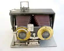 Aux plus fortunés sont proposés des appareils rigides, en bois ou en métal, gainés ou non. Les obturateurs, les diaphragmes, les rampes de mise au point sont soigneusement couplés par des systèmes de biellettes articulées sur des bagues concentriques entourant chacun des objectifs, eux-mêmes très élaborés, souvent de type Tessar ou équivalent. Les plus jeunes ont droit à des appareils moulés en bakélite dépourvus de tout réglage et munis d’objectifs simples.