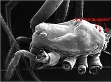 L’appareil stridulatoire des araignées est une différenciation spéciale de leur tégument, paire, symétrique et pouvant occuper une position très variée sur le corps araneidien. Censé pour la plupart des auteurs produire des sons, il peut intervenir dans l’équilibration, ce que confirme l’étude ultrastructurale, notamment chez les argyrodes (theridiidae). Dans ce genre, son aire se localise au niveau du pédicule sur la partie postérieure de prosoma et l’avant de l’abdomen (ci-contre).