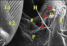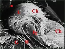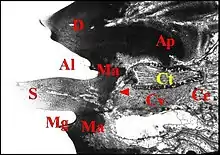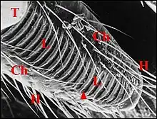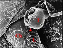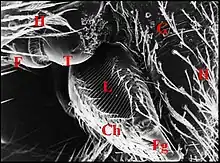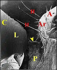 Comme chez les autres Arthropodes, il comporte toujours deux parties bien distinctes, dites « antagonistes », visibles à la loupe binoculaire et surtout, au microscope électronique à balayage (M.E.B.), moyen de recherche incomparable.