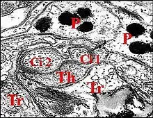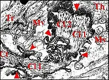 - Deux dendrites, un pour chaque neurone, pénètrent latéralement dans la cellule thécogène, d’abord séparés puis contigus (Fig.26). Leur segment interne (diamètre moyen : 1 µm) renferme des neurotubules, de nombreuses mitochondries, des ribosomes, des corps multivésiculaires et du glycogène. Chacun d’eux donne naissance à un cil à la base duquel se trouve un seul centriole d’où partent des racines ciliaires très courtes. Les microtubules y sont répartis en 9 doublets périphériques. Les cils (Fig.27,28) ont d’abord le même diamètre à leur base (0,4 µm). L’un d’eux devient ensuite plus gros que l’autre puis s’élargit brusquement à son extrémité distale où se différencie un corps tubulaire volumineux (Fig.24, 29 à 31). Ce dernier, long d’environ 15 µm pour un diamètre de 5, renferme de nombreux microtubules associés à un matériel peu osmiophile les unissant entre eux et à la membrane du cil. Il pénètre dans la cavité sous-cuticulaire, y entre latéralement en contact étroit avec l’apodème (Fig.24,29,30) et gagne la base du poil dans sa partie la plus proche de la dent chitineuse.L’autre cil diminue progressivement de diamètre et disparaît au niveau de la base du corps tubulaire.Libres à leur origine sur un trajet très court (1 à 2 µm), les deux