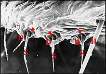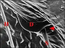 Fig.20 - Argyrodes fissifrontella : Unité d’archet isolée, détail. D, dent ; H, poil banal ; Ma, margelle S, soie ou poil sensoriel. Flèche rouge : alvéoles (fond et membrane articulaire)(A.Lopez, M.E.B.).