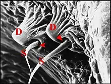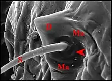 Fig. 19 - Argyrodes sp., unité d’archet isolée: dent et alvéole. D, dent ; Ma, margelle ; S, soie ou poil sensoriel. Flèche rouge : alvéole avec le fond et la membrane articulaire bien visibles(A.Lopez, M.E.B.).