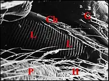 Il est formé par un ensemble d’unités plus ou moins espacées (Fig.21 à 23). Au niveau de chacune d’elles, la cuticule est non seulement épaissie en bloc mais forme aussi à sa surface chaque dent observée au M.E.B. Cette saillie est plus ou moins effilée et régulière ; elle flanque le poil ou soie, qui s’y superpose dans une même coupe histologique (Fig.21) ou est retrouvé, plus dégagé et donc plus apparent, dans la section voisine.