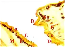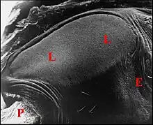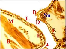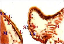 Elle comporte vers l’extérieur une épicuticule régulièrement ondulée, mince (0,4 nm) et présentant deux couches : l’une externe, très dense aux électrons ; l’autre interne, moins dense, moins homogène et d’épaisseur plus réduite. À leur zone de contact, ces couches forment de fines denticulations qui s’interpénètrent et les engrènent étroitement l’une dans l’autre.