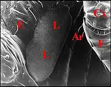 Il est encore formé par des soies fémorales de sorte que l’appareil stridulatoire rappelle, en plus petit, celui de la femelle, seule examinée par Hinton et Wilson (1970)[20].