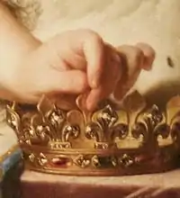 - Fils de France est le titre donné aux fils du roi de France nés en légitime mariage. C'est l'équivalent[20] du titre d'infant donné aux fils des rois de Navarre, de Portugal et d'Espagne. Le titre apparaît au Moyen Âge, d'abord sous la forme de fils du roy de France ou fils de roy de France[alpha 6]. Le titre de fils de France sera ensuite étendu aux fils du dauphin, fils aîné du roi, et même aussi aux fils du fils aîné du dauphin[22],[23].